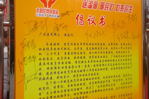 與會領(lǐng)導分別在太陽花幫扶基金倡議書簽名,倡議大家都能有樹立助人為樂、助人為榮的觀念