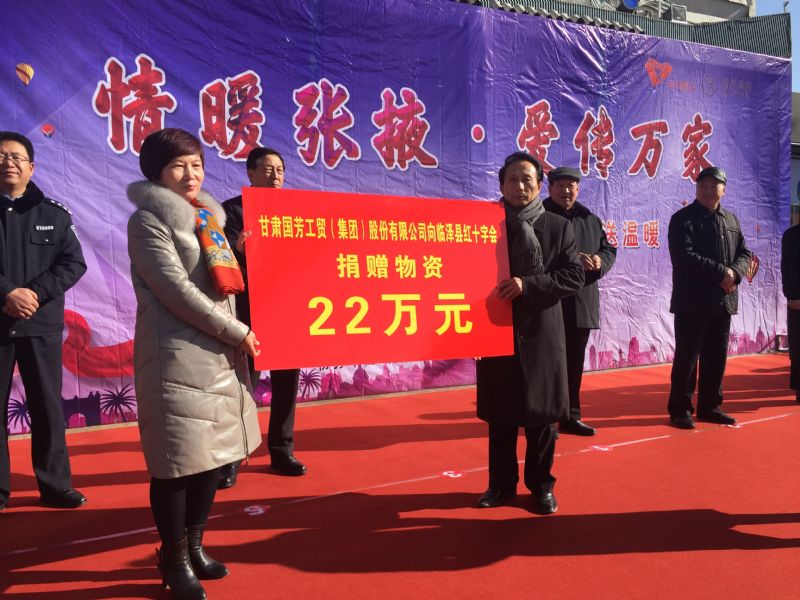 2019年1月11日,甘肅省慈善總會、張掖市慈善協(xié)會、甘州區(qū)慈善協(xié)會以及臨澤縣紅十字會攜甘肅國芳工貿(集團)股份有限公司在張掖市中心廣場共同舉行“情暖張掖·愛傳萬家”送健康送溫暖活動,將2000套棉衣,2000余套秋衣秋褲,27臺彩電以及300余件小家電合計價值148萬元的過冬物資帶給山丹縣,民樂縣的困難群眾,將2500個醫(yī)藥箱帶給臨澤縣的老人們。此次活動傳導社會幫扶、精準扶貧精神的同時也默默為社會傳導著一份正能量。
